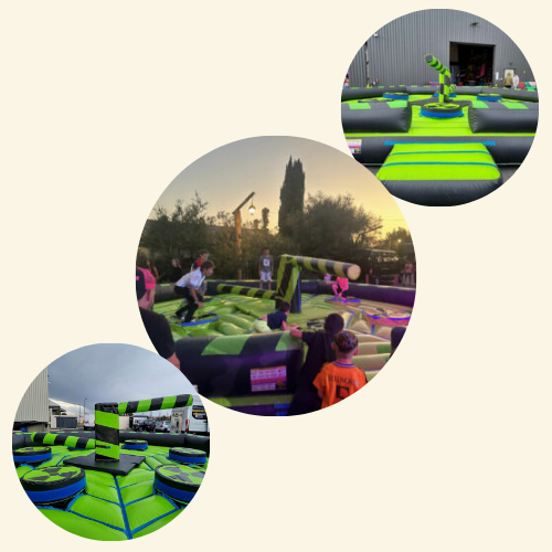 Animation gonflable où les participants s’affrontent sur des poutres en toute sécurité. Rires, défis et sensations garantis !
