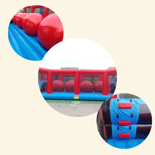 Gonflable d’équilibre où les participants doivent traverser 4 grosses boules sans tomber. Fun et challenge garantis pour petits et grands !